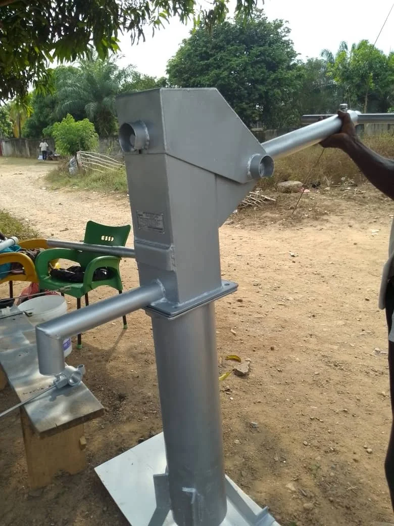 In Adankwame, we installed a borehole with an automatic pump that (through the use of electricity) draws water from the ground. However, many parts of Ghana do not have reliable access to electricity. For our next two projects, we will be installing pump boreholes—boreholes equipped with hand pumps—so that users can manually draw water from the ground, regardless of whether electricity is available.